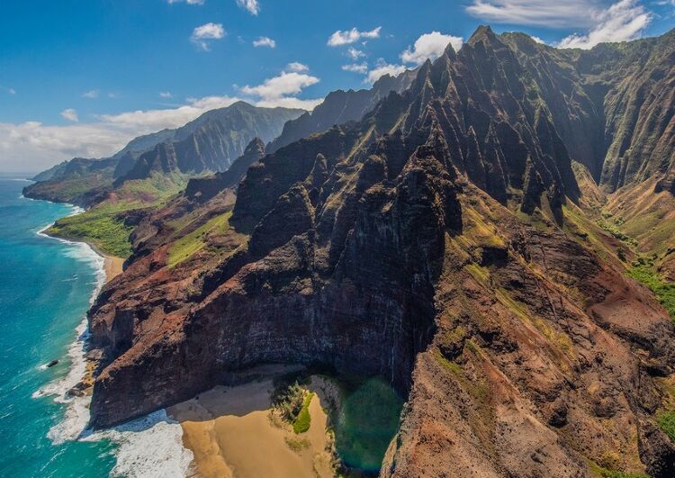 カウアイは自然の傑作です。 600万年以上の間、自然の力はカウアイ島を彫刻し、形を変え、世界で最も美しい風景のいくつかを作り出してきました。 「ガーデンアイル」と名付けられたカウアイ島は、緑豊かな渓谷、そびえ立つ海の崖、厚いジャングルの植生、曲がりくねった川、そして豪華な滝に覆われています。カウアイ島のノースショアに沿って17マイルにわたり、崖と谷が自慢の有名なナパリ海岸があります。南西には、「太平洋のグランドキャニオン」と呼ばれるワイメアキャニオンがあります。見どころがたくさんあるので、カウアイ島のヘリコプターツアーはカウアイ島の美しい緑、大自然を見尽くせる唯一の方法です!
