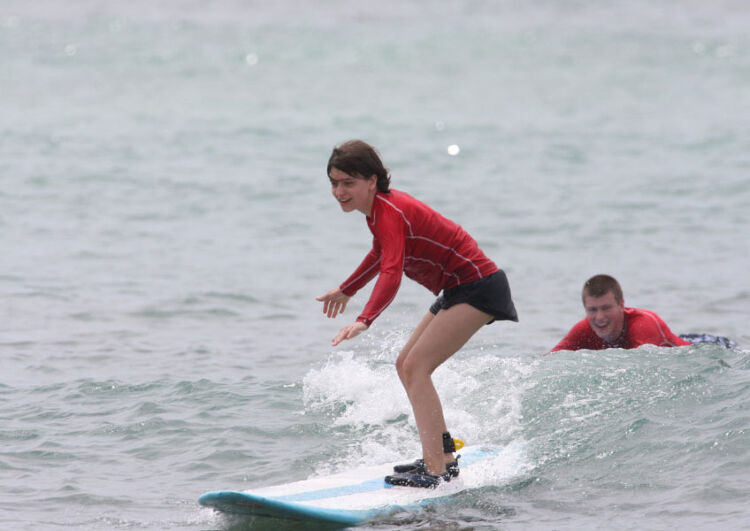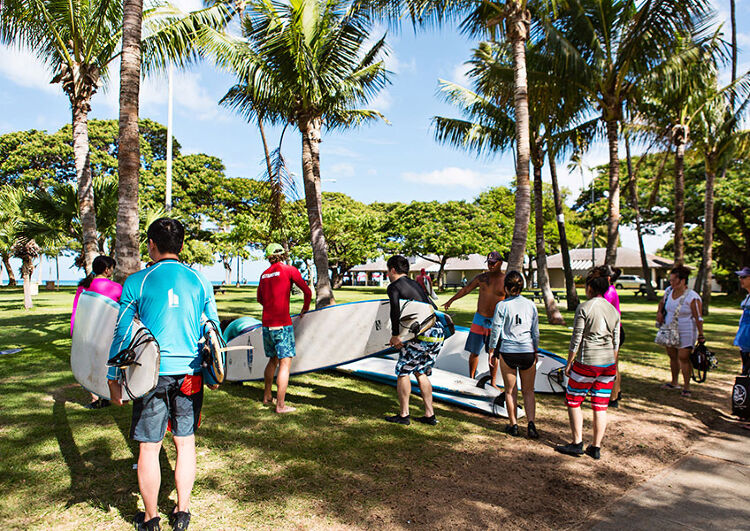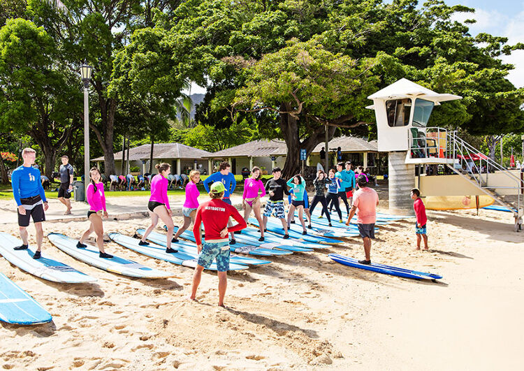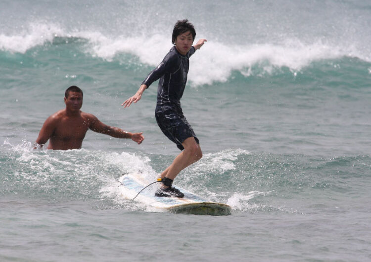 ハワイ出身のロコ・ボーイズたちが手取り足取り親切に教えてくれるレッスンでは技術や知識を習得できるのはもちろん、アロハ精神豊かなスタッフの「生徒をオハナ(家族)同様に思い、海を一緒に楽しむ」のモットーに基づいた、ロコ風サーフィンが体験できる。初心者から上級者までその人のレベルに合わせたレッスンを行なっています。グループレッスンは一番人気のレッスンで、3〜4人の生徒につき1人のインストラクターで行われます。陸上でサーフィンの基礎的なテクニックをしっかり教わったあと海へ出発します!